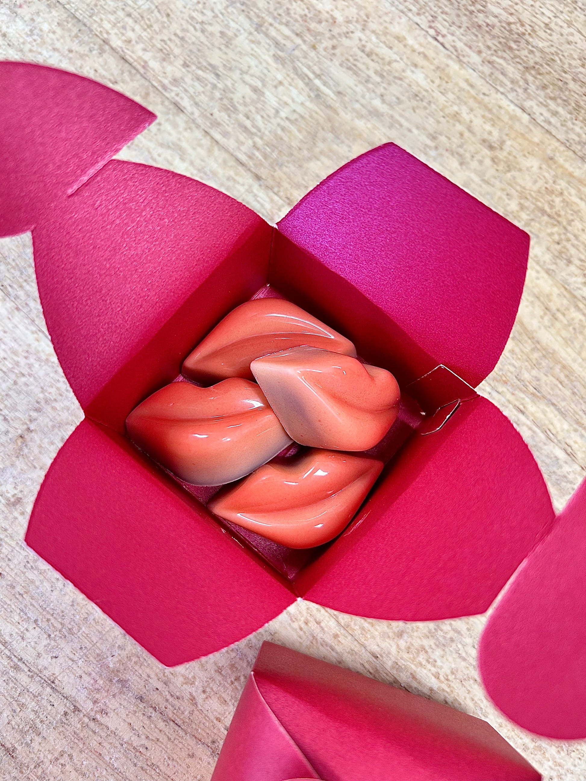 Fyra praliner på ca 3-4 cm gjort på ett skal av vit choklad. Fylld med mintfondant & mörk chokladganache.