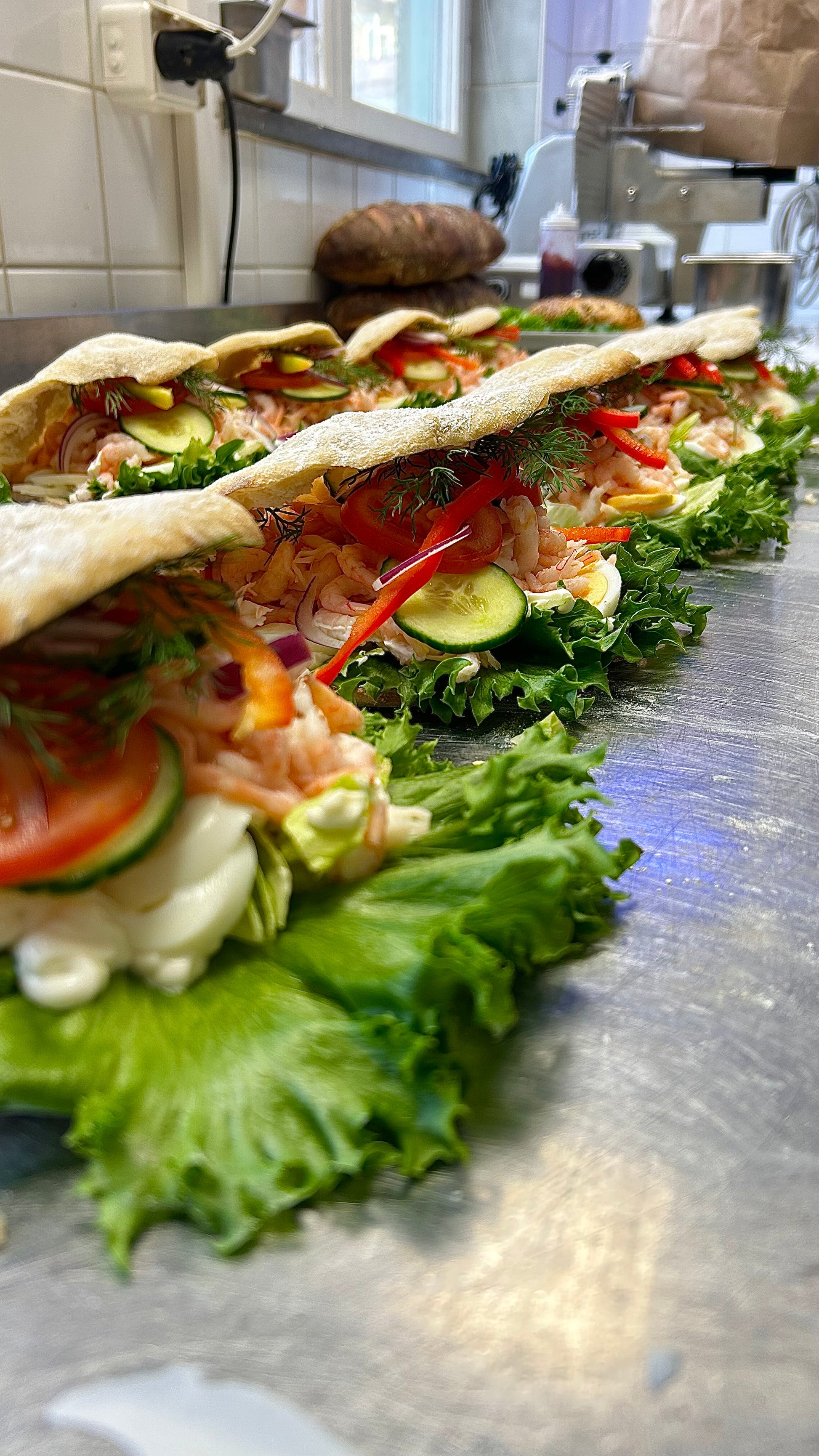 En räksmörgås på surdegsbröd. Bestående av majonnäs, räkor, ägg & grönsaker.